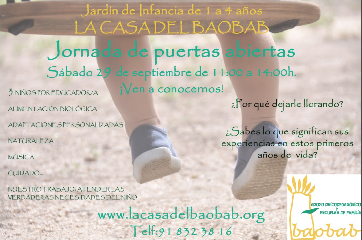Este año espero poder ir a esta jornada, y así mismo que los vecinos de la zona de Madrid Noroeste podamos conocer esta escuela y las propuestas que nos ofrece: 3-4 niños por cuidador, contacto con la naturaleza, música, comida ecológica.. muy interesante!! Espero que tengan una gran acogida!