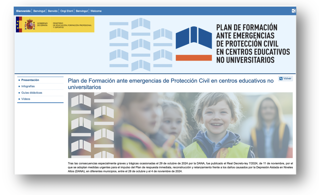 En la web de la Moncloa se explica el Plan de Formación ante Emergencias dirigido a 25.000 Centros Educativos promover la cultura de la prevención. Dicha iniciativa llegará a unos 8 millones de estudiantes y está incluida entre las diez prioridades del Pacto de Estado frente a la Emergencia Climática impulsado por el Ejecutivo. Además, se indica el enlace al portal habilitado por Educación sobre este plan de formación, que contiene muchísimos recursos valiosísimos.