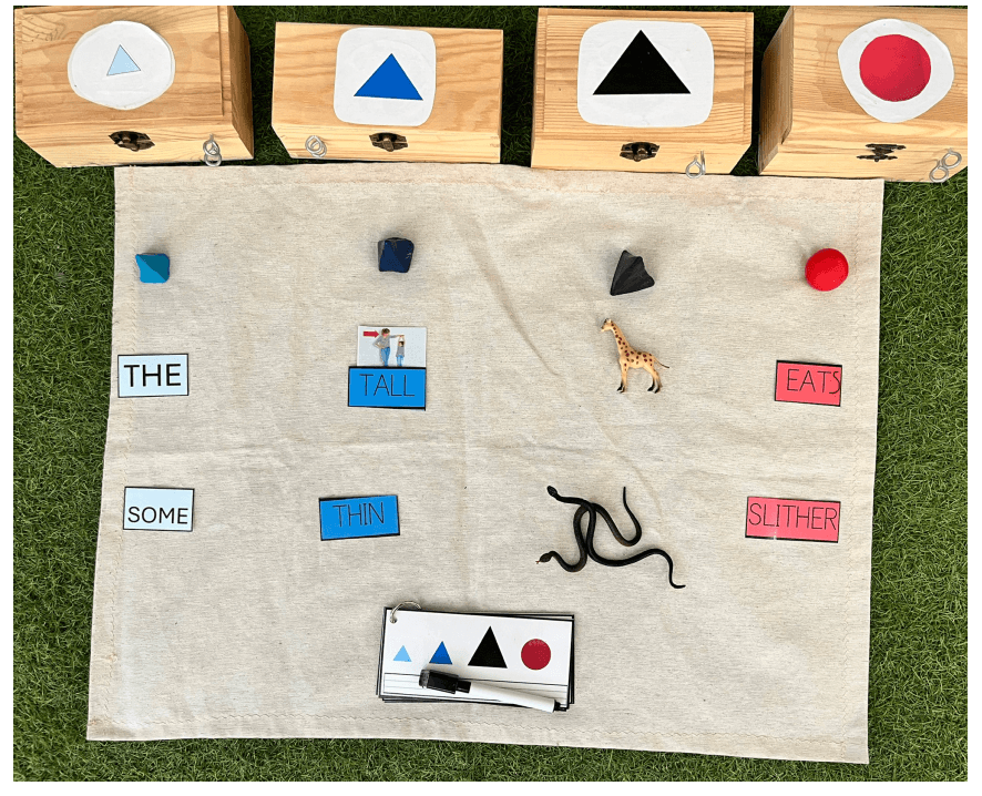 En el área de lengua extranjera, se han introducido bandejas con tarjetas de vocabulario, imágenes y pequeños juegos que facilitan la adquisición del idioma de forma visual y dinámica. Este tipo de materiales resulta especialmente útil para el alumnado con NEE, ya que combina el aprendizaje visual con la manipulación, favoreciendo la comprensión y la retención.